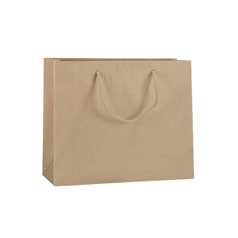 Elegantní přírodní dárková taška z pevného hnědého sulfátového (rýhovaného) papíru s kvalitními textilními šňůrkami. Taška působí moderně, minimalisticky a díky přírodnímu vzhledu je ideální pro ekologické balení dárků i firemní prezentace.