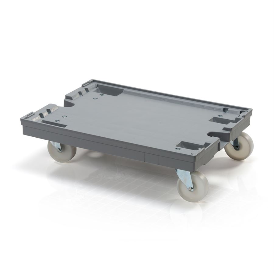 Vozíky pod přepravky jsou ve skladech a při přepravě velmi užitečným pomocníkem. Pevná a kvalitní kolečka s gumovým pláštěm zdolají prakticky jakýkoliv povrch a neničí se. Tento vozík má 2 otočná kolečka a tím umožní manipulaci s naloženými přepravkami především dopředu a nebude ujíždět s přepravkami na nerovném povrchu.